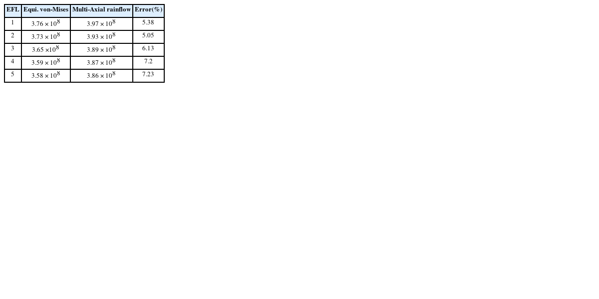 식(8)의 다축레인플로우기법을 비교하기 위하여 각각의 기법을 이용하여 구한 등가피로하중(EFL)을 계산하여 서로 비교하였다.