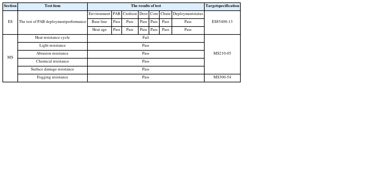 뮤셀공법을 적용하여 외관품질을 확보한 시제품에 대해 슈트 융착 및 도장공정 까지 진행하여, 에어백 전개 시험과 원소재 신뢰성 평가을 실시하였다. 평가항목은 ES84500-13, MS210-05 및 MS300-54를 기준으로 선정하였다. 해당 항목에 대한 시험 결과는