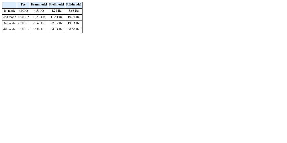 Table 4와 같이 빔 모델의 경우, 시험 결과와 비교하여 4차 모드에서 최대 22.93%의 오차가 발생하였으며 전체적으로 큰 오차가 발생하는 것을 확인하였다. 쉘과 솔리드 모델의 경우, 최대 오차는 각각 4차 모드와 2차 모드에서 14.60%와 14.50%로 발생하 였으나 그 외의 모드에서는 10% 이하의 오차가 발생하였다.
