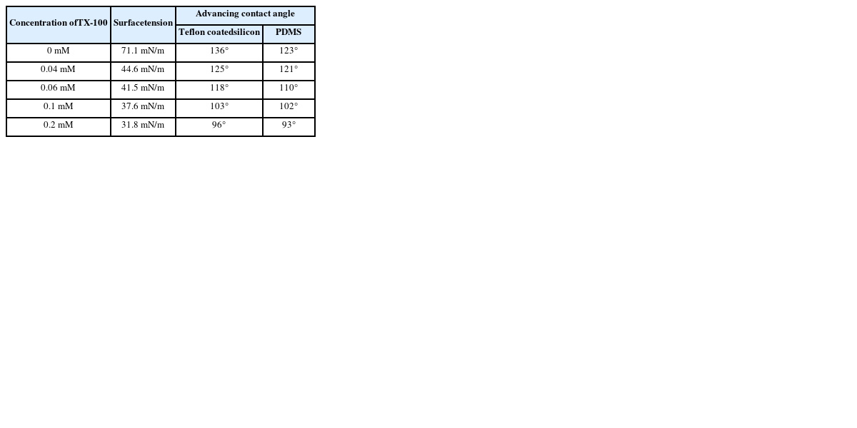 본 실험에서는 계면활성제인 Triton X-100(TX-100)을 0.04 mM에서 0.2 mM까지 첨가하여 용액의 표면장력을 조절하였다. 준비한 용액은 링 방식(Ring Method)의 표면장력 측정기(LAUDA, Ring/Plate-Tensiometer TD2)를 이용하여 상온에서 표면장력의 크기를 측정하였다. 채널 벽면 표면에서의 전진 접촉각을 측정하기 위해 실리콘과 PDMS 재료의 평판(Plate) 샘플을 준비하였으며, 일정량(Volume-6 μL)의 액적을 표면에 올려 놓고 천천히 표면을 기울이면서 액적이 움직이기 시작할 때 이미지를 분석하여 전진 접촉각을 측정하였다. 실제 프린팅 노즐은 Teflon 용액(0.1%, v/v)을 이용하여 소수성 코팅 후에 사용하였기 때문에, 측정 실리콘 샘플도 동일한 방법으로 Teflon 코팅이된 샘플에서의 전진 접촉각을 측정하였다. 계면활성제 농도별 용액의 표면장력 및 전진 접촉각 측정 결과는
