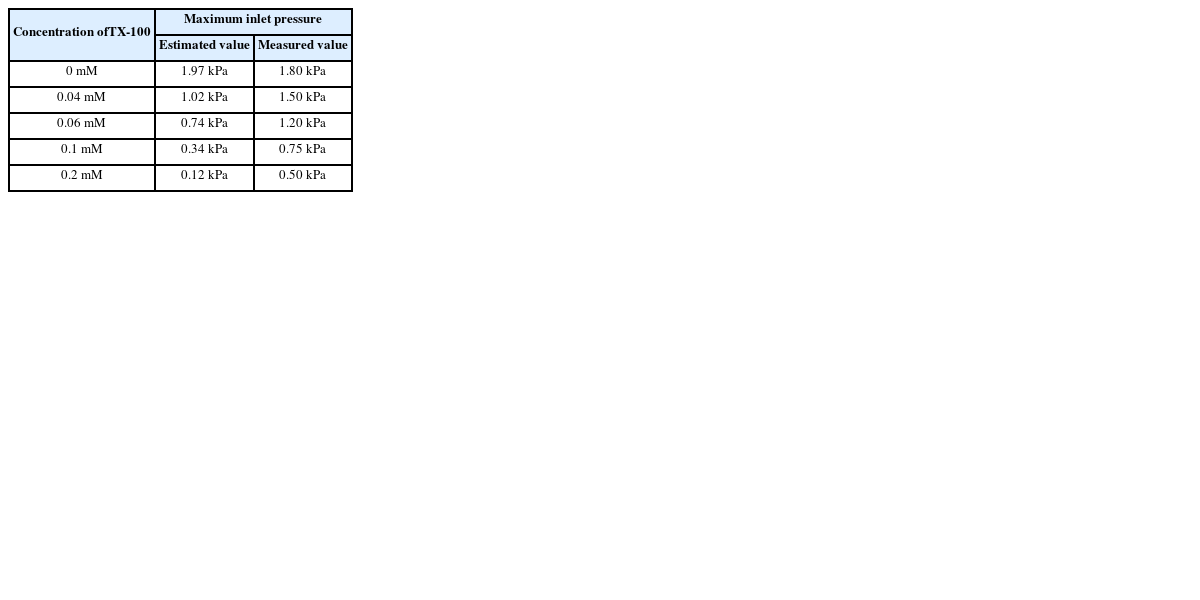 식(2)을 이용하여 이론적인 최대 입구 압력을 계산하였으며, 그 결과 탈이온수를 제외하고 계면활성제가 포함된 용액의 경우 실험적으로 측정된 값보다 다소 낮게 계산되었다(