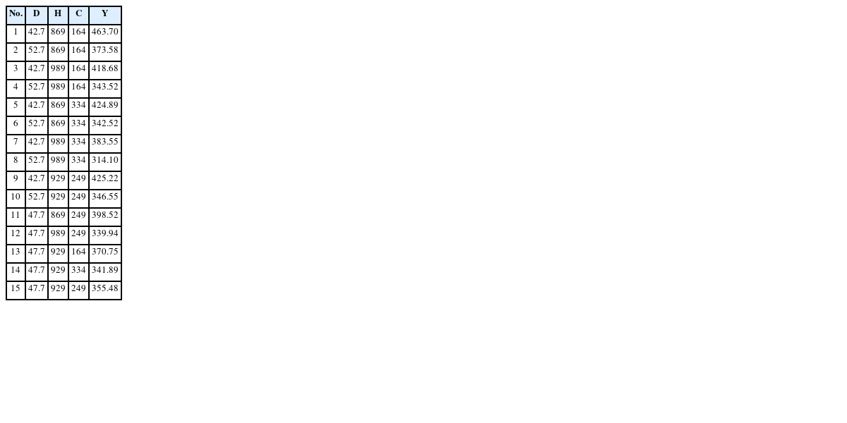 5개의 인자(D, H, C, B, W)에 대해 직교배열을 실시하기 위해 L16(215) 직교배열표를 이용하여 직교배열을 실시하였다.