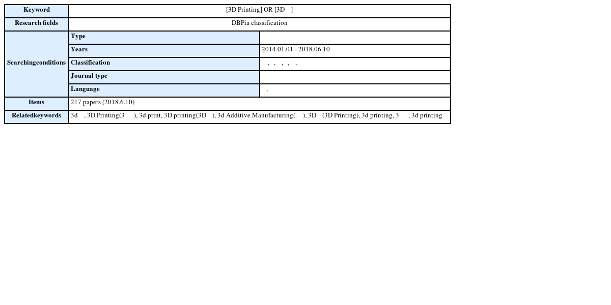 3 등과 같은 항공우주 분야 대형 소량생산 첨단부품 분야 논문을 별도로 분류하여 검토한 결과(금속 프린팅 분야 35건, 의료-치과 분야 27건, 항공우주 분야 1건)를 나타낸다. 금속 프린팅 연구논문은 35건으로, 공학분야 논문 106건의 약 33.0%를 차지하고 있었으며, 또한 전체 논문 217건에 대해서는 16.1%로서 3D 프린팅에의 금속소재 적용에 관한 연구가 국내에서도 활발하게 진행되고 있음을 시사하고 있었다.