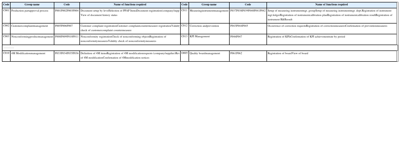 This study identifies and analyzes the manufacturing business processes for 30 SMMEs. Although there are some differences in the level and scope of work, the results of this analysis show that approximately 60 business activities are performed by the SMMEs, and 20 activities of them are directly or indirectly related to QM. Through interviews with relevant stakeholders (quality department, management, etc.) and an analysis of relevant documents in the area of quality related business activities, this study derives the functions required for quality business performance. The required functions derived through the analyzed manufacturing process are assorted, and the related ones are grouped together. Through this process, a total of 62 user-required functions are grouped into 18 groups. Of these, 13 functional groups are the groups of common functions that are essential for performing quality services and the remaining 5 functional groups are optional functional groups that can be selectively used for each company (see A1. Derived required functions and grouping result). Here, the common groups include the items required by the standard quality (ISO 9001: 2015) for product and service development, performance evaluation, and improvement, and they are interpreted as the minimum business activities necessary for the quality business in the manufacturing enterprise.