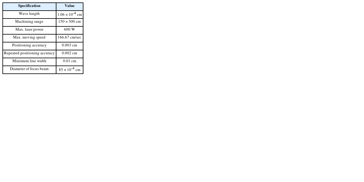본 실험에서는 600 W급 Nd:YAG 연속파 파이버 레이저를 사용하였다. 소스는 nLIGHT, 헤드는 RayTools 사의 것을 사용하였다. 레이저 가공 시, 보조가스로 산소를 사용하면, 질소나 공기를 사용할 때보다 산화물이 덜 형성된다. 윤혁중 등