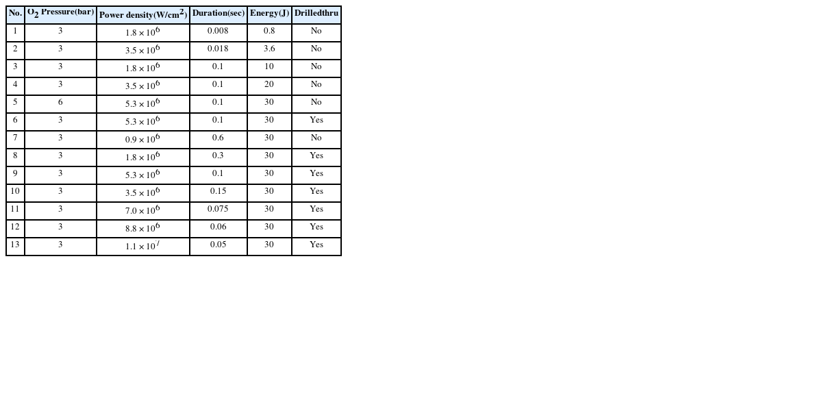 레이저의 1회 발진으로 알루미나를 관통할 수 있는 조건을 찾기 위한 실험을 수행하였다. 초점 위치를 시편 두께의 중간으로 고정하고 산소 압력, 파워 밀도, 조사시간을 조정하였다. 연속파 레이저 에너지는 출력과 조사시간을 곱이며,