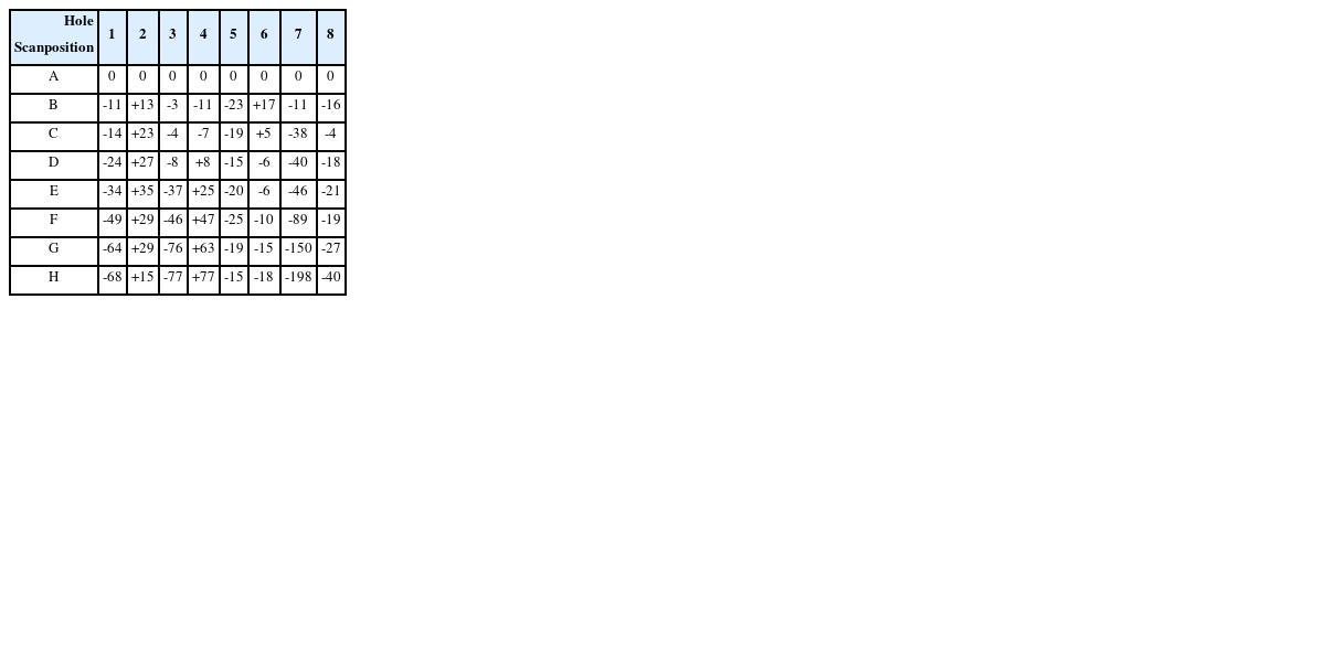 i = A, B, C, D, E, F, G, H)라고 하였다. 각 스캔 위치에서 대표 원 직경과 목표 직경 차이 합의 평균을 구멍의 가공 정밀도 오차