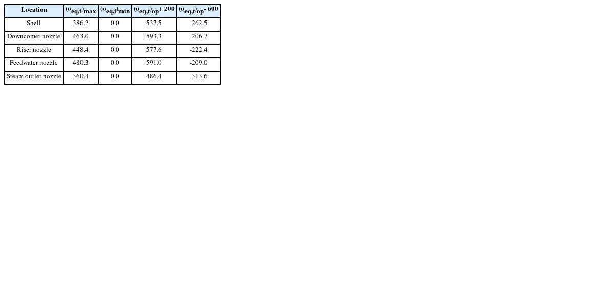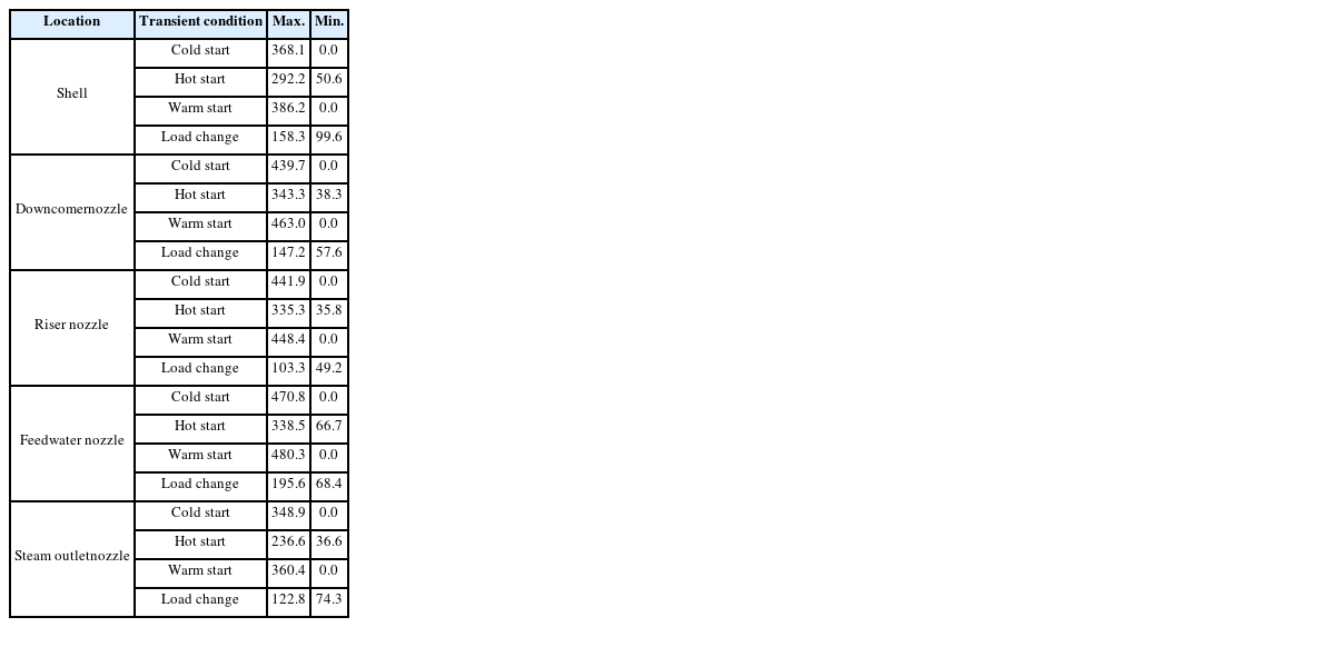 식(1)은 과도운전조건에서 물 접촉 표면에서 허용되는 인장응력의 한도는 (운전압력에 의한 응력) + 200MPa이고, 압축응력의 한도는 (운전압력에 의한 응력) − 600 MPa임을 의미한다.