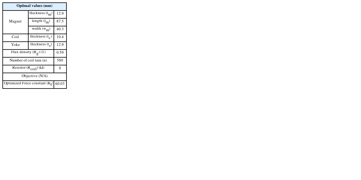 식(2)에서 알 수 있듯이 자속 밀도, 전류의 세기, 코일의 감긴 수, 그리고 자속 밀도 내에서 존재하는 코일의 길이이다. 이런 사항들을 결정하는 것 중 중요한 영향을 끼치는 설계 변수는