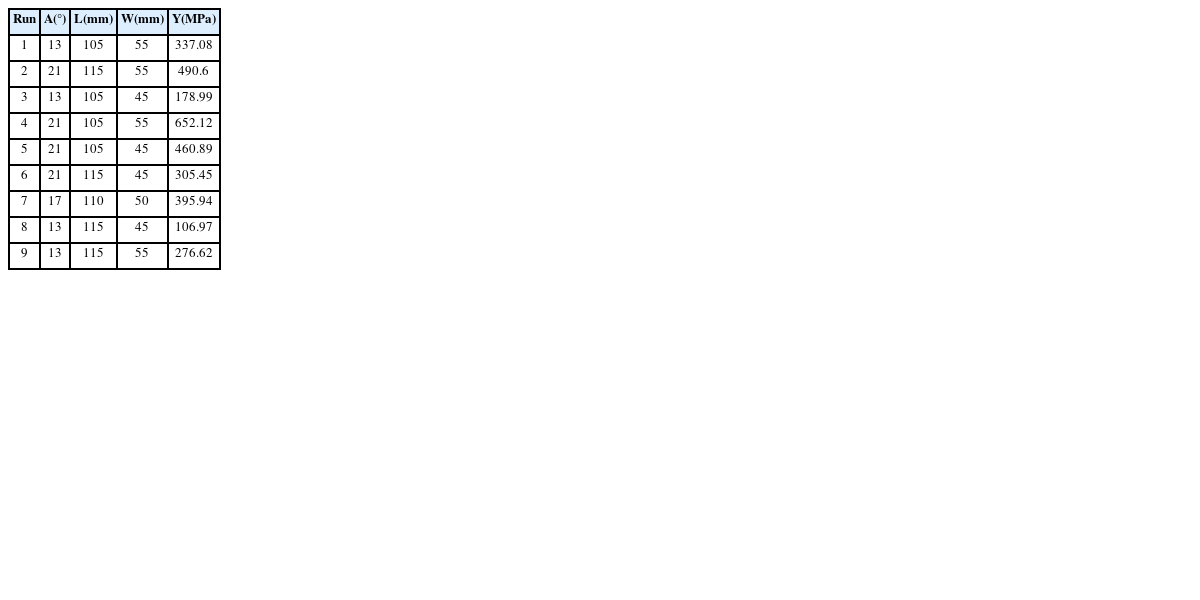본 논문에서는 1톤 트럭과 결합되는 소형 너클크레인에 대한 유한요소해석 결과와 재질의 항복강도를 비교하였으며, 국제표준 ISO 8686-2에 따른 안전율을 고려하였을 때 붐에서는 파손이 예측되지 않았으나 링크 2의 플레이트에서는 파손이 예측되었다. 안전성을 확보하기 위하여 A(링크의 굽힘 각도), L(핀홀부터 절곡부까지의 거리), W(플레이트의 너비) 인자를 선정하여 실험계획법을 통한 링크의 최적화를 진행하였고, 그 결과는 아래와 같다.