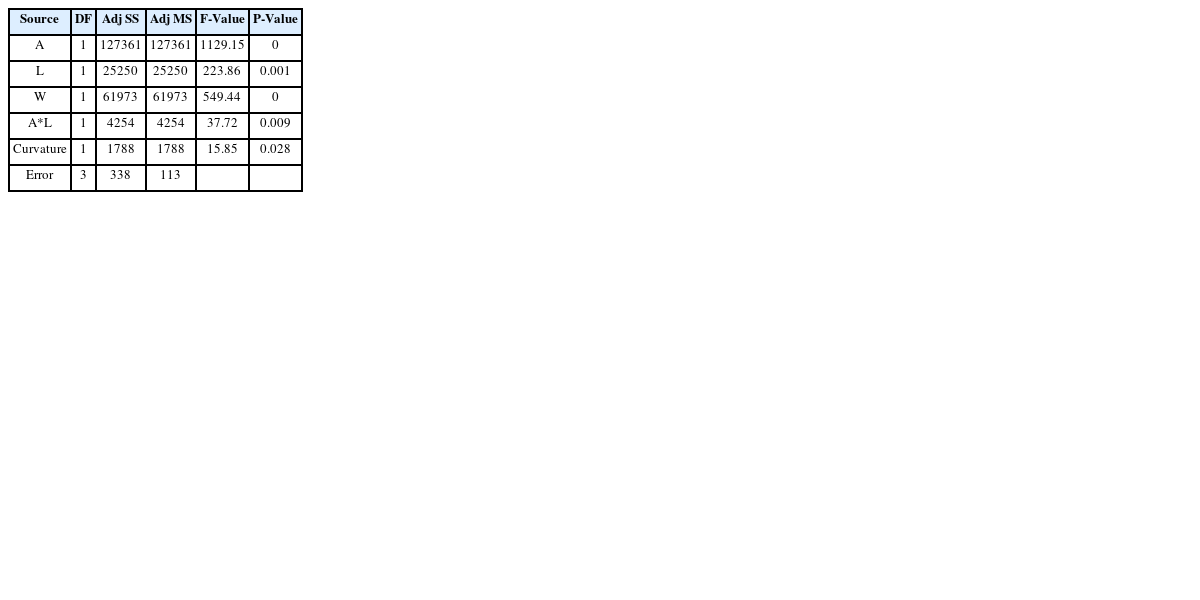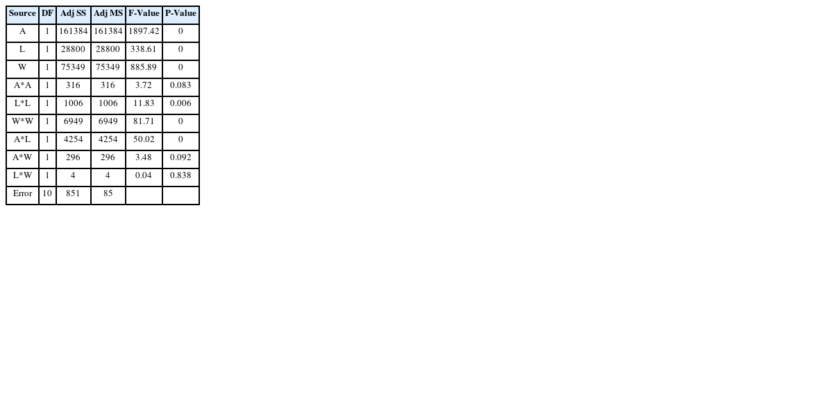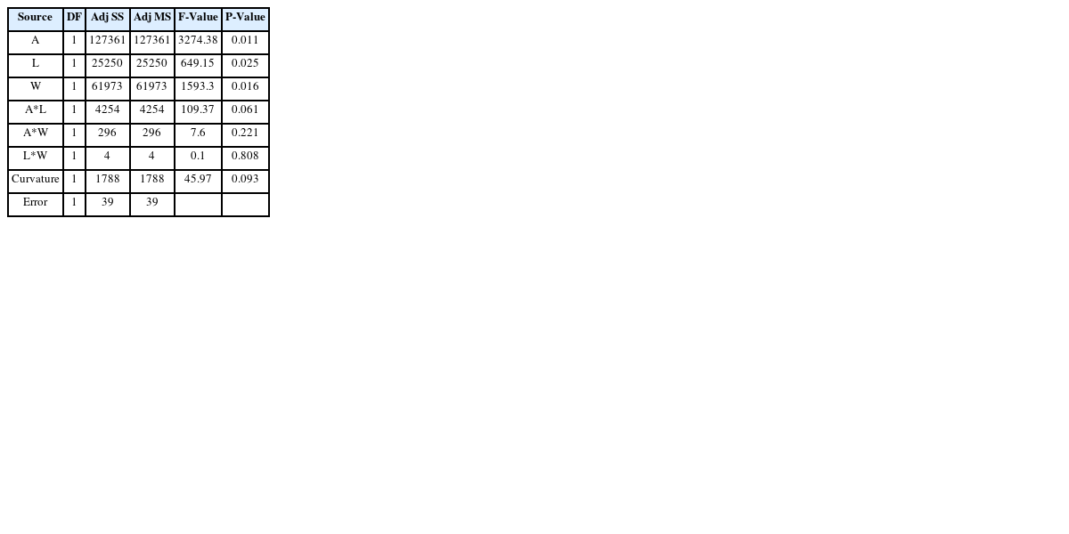 P-Value를 분석하면 A, L, W는 각각 0.011, 0.025, 0.016이며, 인자들의 교호작용인 A*L, A*W, L*W는 각각 0.061, 0.221, 0.808이다.