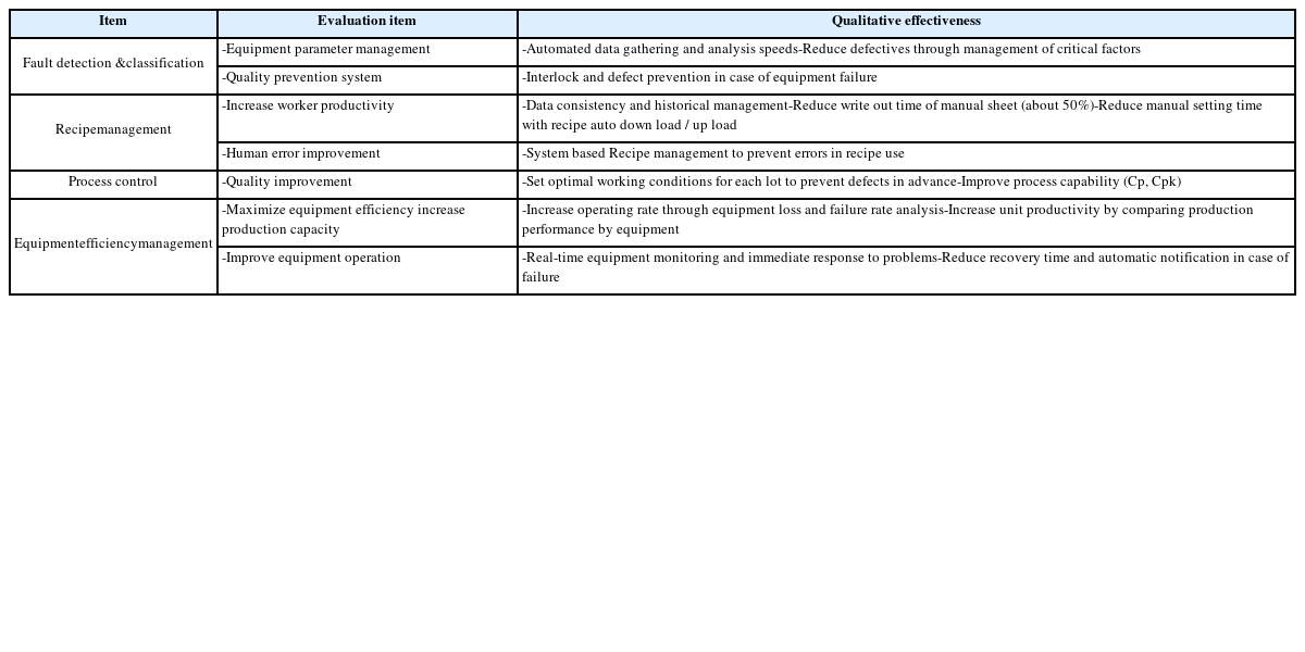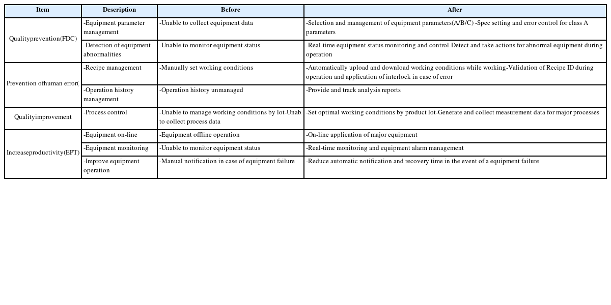 Table 2 divides FDC, RMS, R2R, and EPT, which are classified based on performance before and after the application of the equipment engineering system. The work areas were further subdivided into categories such as equipment parameter control, equipment error detection, work condition management, work history control, operation condition setting, equipment on-line, equipment monitoring, and equipment operation improvement.