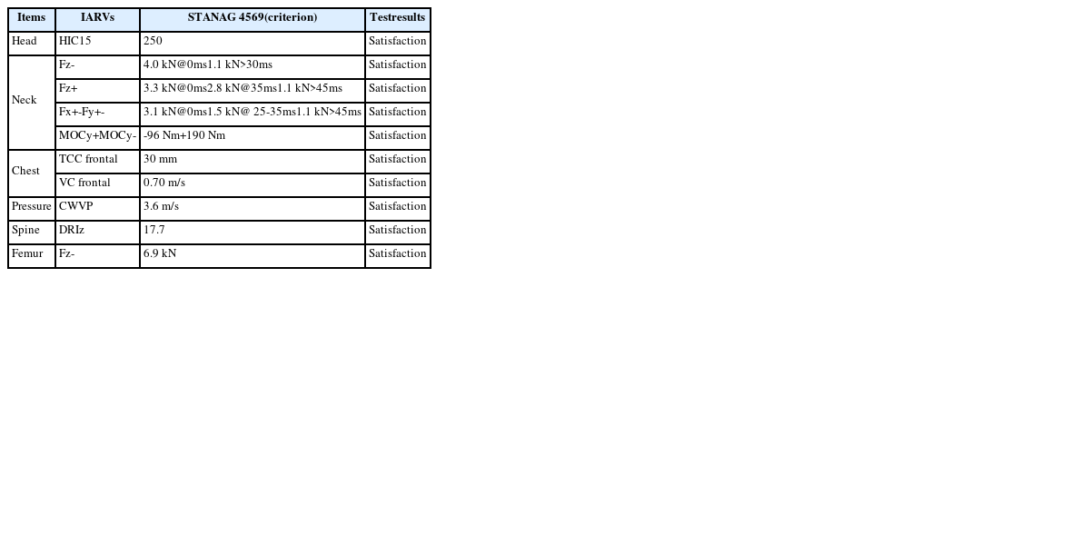 Table 5는 개념모델과 부분구조의 지뢰폭발 시험결과를 종합한 것으로써, 시험결과로부터 방호성능 및 인체 상해치 안전성을 확인할 수 있었다.