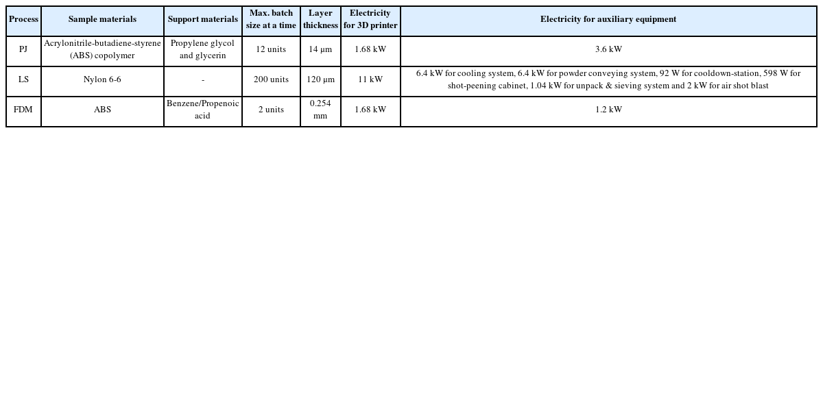 모든 3D 프린터가 적층제조 공정 시작 이전에 가공에 적합한 시스템 온도에 도달하기 위해 예열 작업이 필요하다. 기계별 공정특성에 따라 PJ와 FDM을 예열하는데 소비되는 시간은 10분, LS는 2시간이었다. 각 3D 프린터에 대한 예열과 출력에 대한 전력 소비는 프린터 사양의 전원 요구사항을 참고하여 분석에 적용되었다.