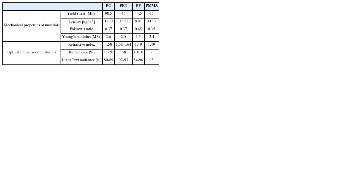Table 1, the material properties of general purpose resins which are inexpensive, have excellent optical properties, and can be injection-molded easily are summarized. All materials have similar optical properties. However, for the mechanical properties, the PC is superior to other materials. Therefore, PC is selected as the material of the light guide in this study.