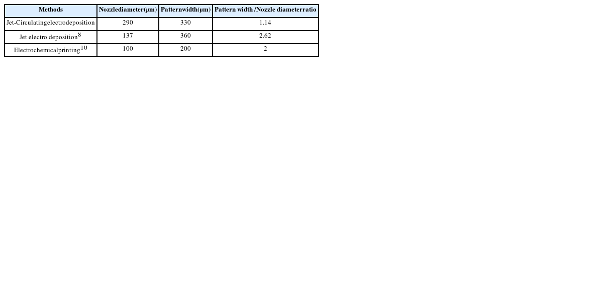 Table 2와 같이 기존의 국부화 전해증착을 이용한 패턴 제작 기술과 비교했을 때 노즐 직경 대비 패턴의 너비는 1.14로 2 이상의 기존 방식에 비해 우수함을 확인할 수 있었으며, 노즐 직경의 감소를 통해 더욱 미세한 패턴을 제작 가능성을 확인할 수 있었다.