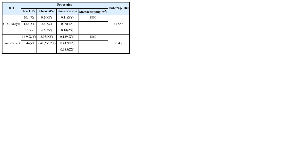 개발 초기 탑재장비 본체에 대한 동특성 해석 결과가 1차 고유진동수가 447.56 Hz로 나타났었는데, 이는 PCB 기판 FR-4에 대한 물성치 데이터를 제작업체나 문헌에서 제공되는 것이 아닌 상용 프로그램에서 제공된 데이터를 이용하였고, 최종 해석 시에는 유사 기판에 대한 문헌을 참조하여 해석을 실시하였는데,
