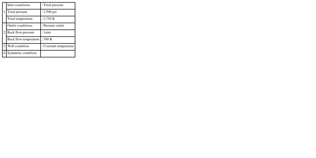 +는 30을, 벽면온도로는 2,000 K를 사용하였다. 난류모델로는 K-Omega 모델을 사용하였으며 기타 경계 조건은