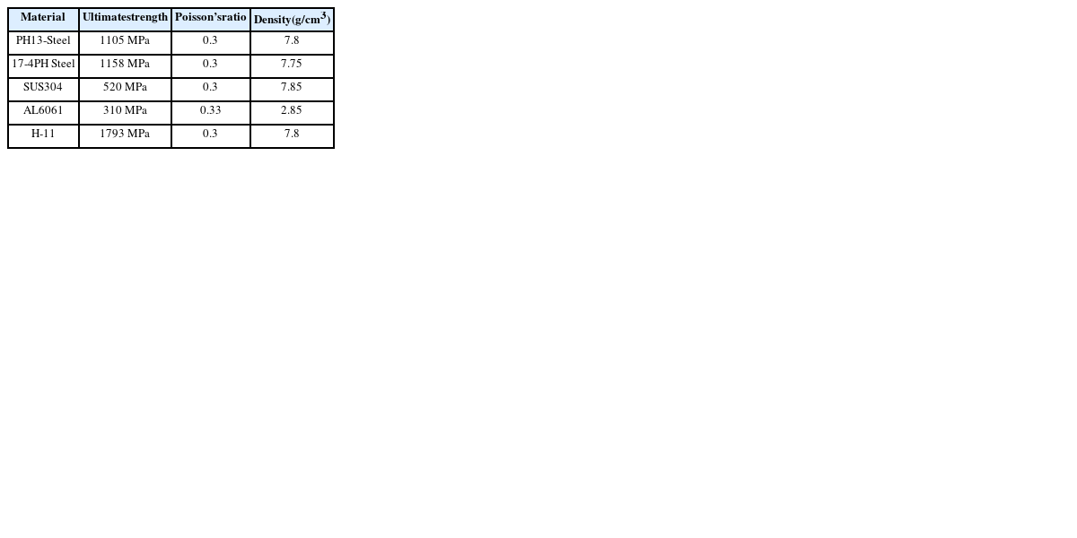 Table 1에 표시하였다. PH13-Steel, 17-4PH Steel, AL6061은 MMPDS-01을 참조하였으며 SUS304는 North American Stainless, H-11은 Aircraft Materials를 참조하였다.