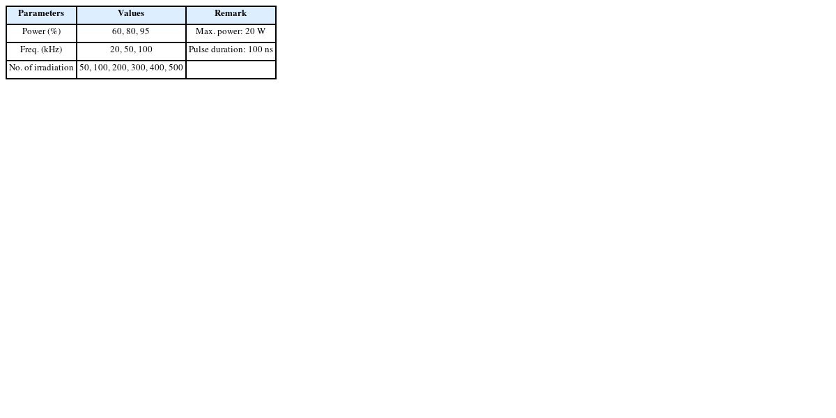 Table 2Laser micro cutting results according to power, frequency and scan speed
