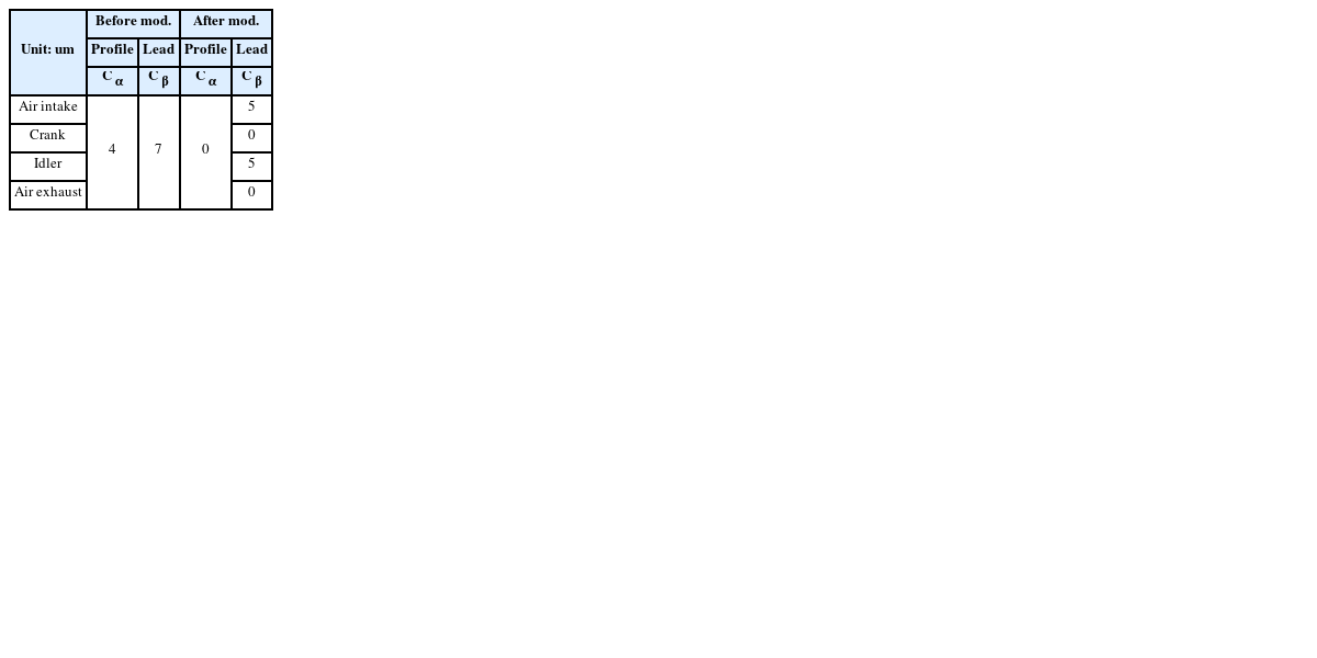 The gear micro-modifications used to reduce tooth corner contact and dynamic excitation of the gear pair, which effect in gear whine noise reduction. Micro-modifications can also be applied on the involute and lead of gear teeth. In this paper, the input torques are too small for the gear train, contrast to no modification (Without gear micro-modification for the gear train) and before modification (Before mod.), only gear profile crown and lead crown are implemented for the gear of air intake and the idler gear after modification (After mod.). As we known, micro-modification parameters cannot be varied individually to evaluate the sensitivity of the durability and NVH performance, and even ideal designs can rarely be manufactured for mass production. Thus, in order to quickly evaluate the results of the nominal modifications, only nominal values of gear micro-modification are used for this gear pair without the consideration of manufacturing tolerance. And the nominal micro-modification parameters are shown in