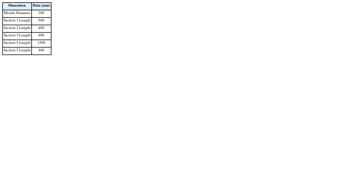 Fig. 5와 같이 5개의 섹션으로 이루어진 유도탄을 가정하였다. 각 섹션은 유도탄의 전방으로부터, 타켓의 위치를 계측하기 위한 탐색기부, 유도탄의 자세를 측정하기 위한 관성항법부, 유도탄을 제어하기 위한 구동부, 유도탄의 추진력을 얻기 위한 추진기관부, 유도탄의 자세를 안정화하고 지상 장치와 연결하기 위한 후방부로 나누어져 있다. 유도탄의 치수는