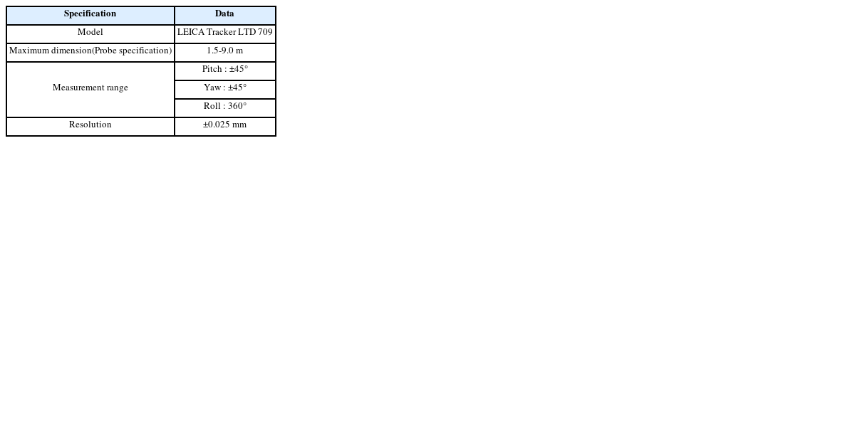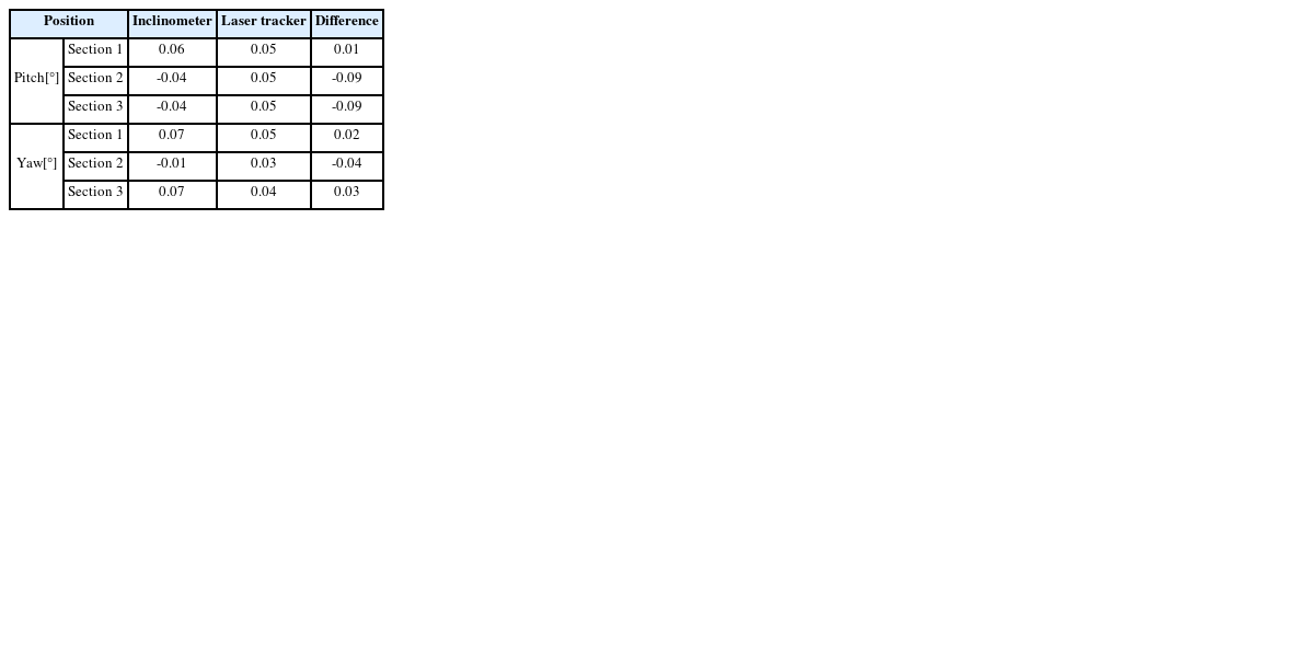 Table 6과 같다. 기존의 3차원 측정장비의 경우, 원통 구조물에 대한 조립 정렬 오차를 확인하기 위해 최소 6 Point 이상의 위치에 대하여 측정 및 계산을 수행해야 했으나, 경사계 기반 조립 정렬 오차 측정 방식의 경우,