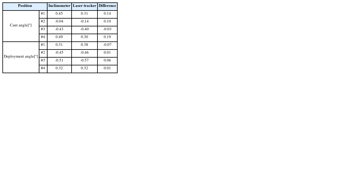 Table 5에 보였다. 경사계 기반 조립 정렬 오차 측정방식과 기존의 3차원 측정 방식의 차이는 #3 조종날개의 전개각 차이에서 확인할 수 있듯이 최대 약 0.49° 수준으로 검토되었다. 이는 Ryu 등