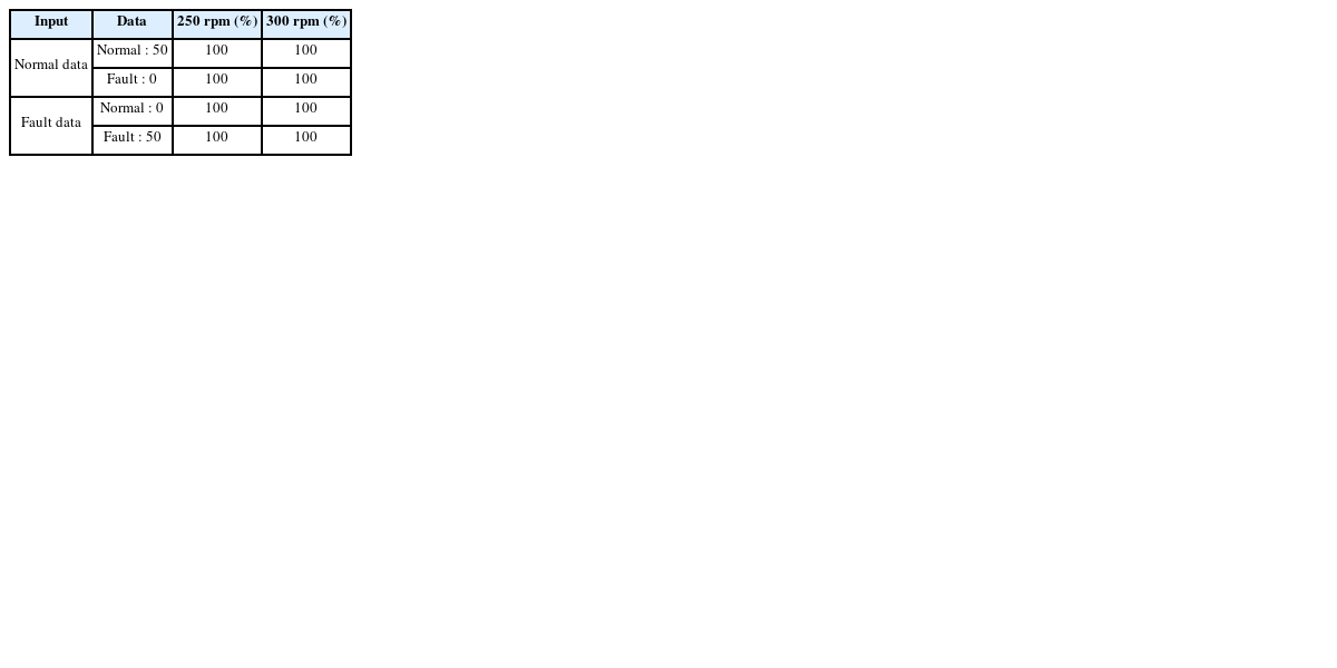 Table 8에 표기하였다. 분류기에 입력한 테스트 데이터는 정상 데이터 50개와 고장데이터 50개를 입력하였다. 분류기의 성능을 높이기 위하여 트레이닝 데이터와 테스트 데이터를 0에서 1 사이의 값으로 정규화(Normalize)하여 분류기에 입력하였다.