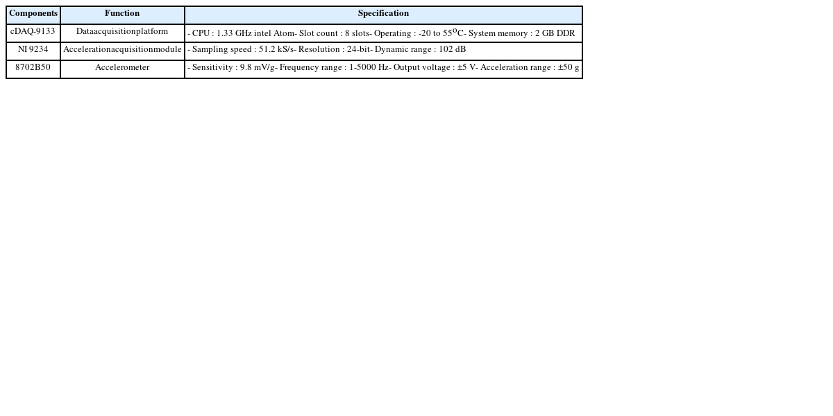 Table 2에 설명하였다. 또한, National Instrument사의 프로그래밍 언어인 LabVIEW를 사용하여 데이터를 수집 및 분석하는 방법을 직접 프로그래밍하여 사용하였다. CompactDAQ는 다양한 형태의 신호를 수집하기 위한 독립적 데이터 획득 모듈을 지원하며 이 연구에서는 가속도계로부터 측정된 진동데이터를 수집하기 위한 모듈로
