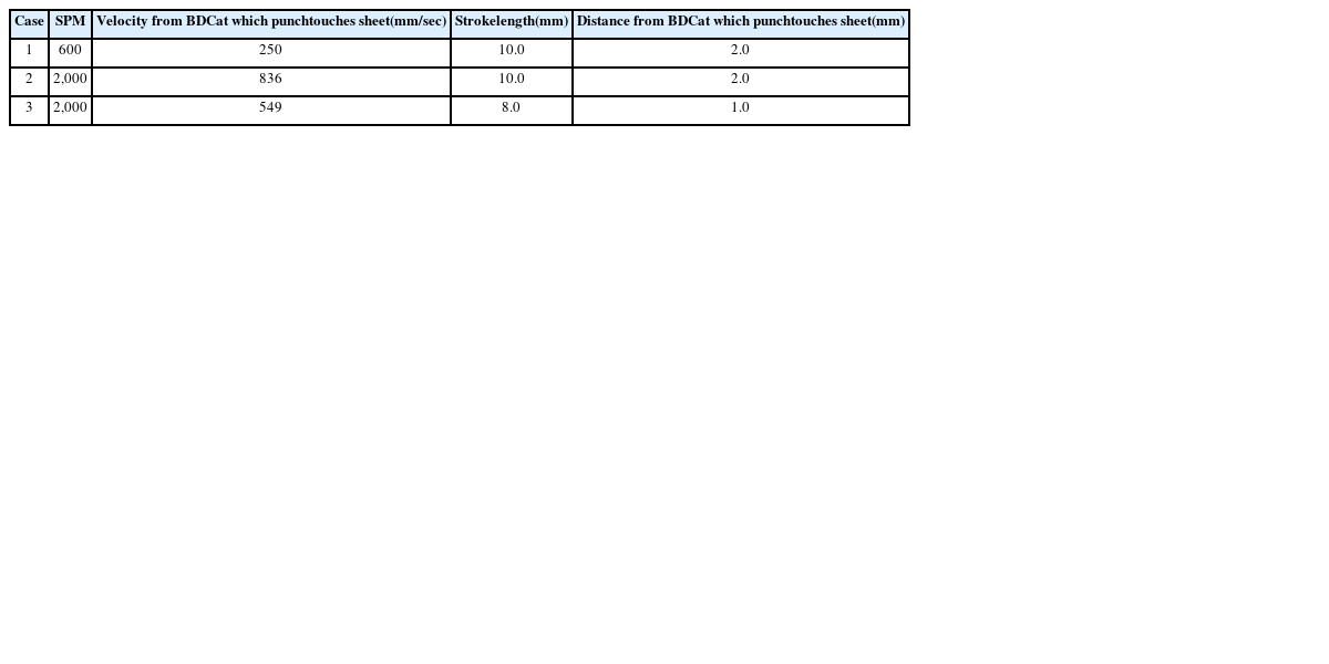 Table 4과 같이 3가지(Cases-1, 2, 3) 조건으로 진행되었다. Case-1은 국내 커넥터 프레스 업계의 평균적인 작업조건이다. 작업속도는 600 SPM, 프레스기 스트로크는 10 mm, 펀치가 재료를 타발하는 시점은 하사점으로부터 거리 2.0 mm로 설계했다. Cases-2는 1과 동일한 설비 및 금형 조건에서 작업속도를 초고속 영역인 2,000 SPM으로 상승시킨 것이다. Cases-3은 2와 동일한 초고속 작업 속도에서 설비 스트로크를 10.0 mm에서 8.0 mm로 변경하고 펀치의 타발 시점을 하사점으로부터 거리 2 mm에서 1 mm로 변경한 것이다. 스트로크 8.0 mm는 초고속 프레스기에서 범용성을 확보한 최소한의 거리이고 펀치의 타발 시점 거리 1.0 mm는 현재 보유한 금형 기술 내에서 구현 가능한 최소치이다.