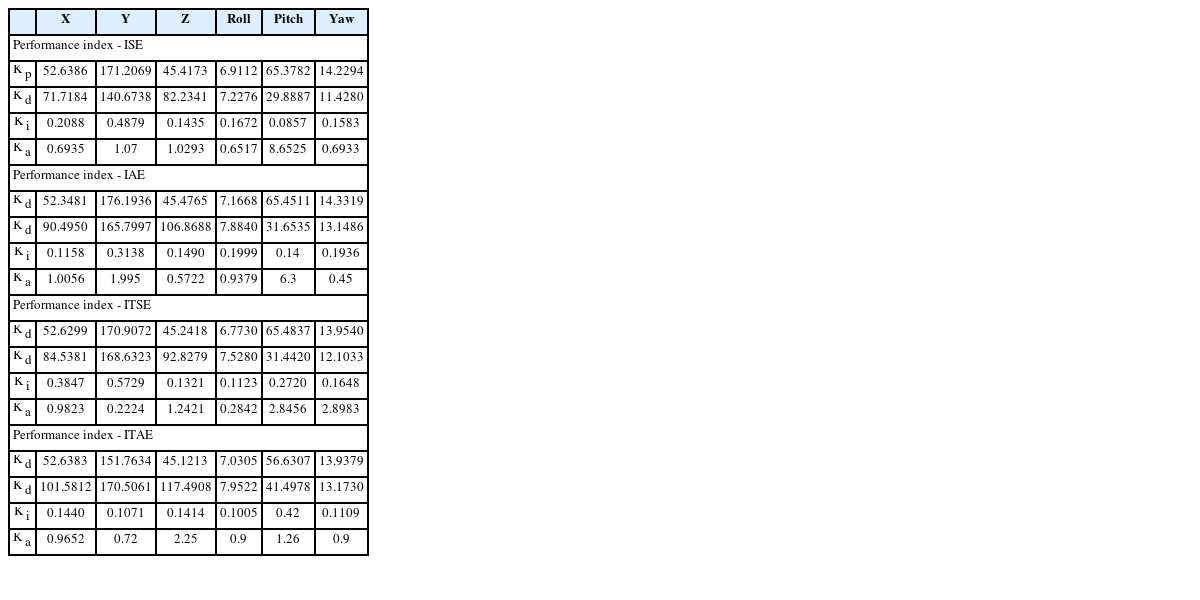 시스템의 오차를 정의하는 방법에는 여러가지가 있다. 시스템 오차에는 제곱 오차 적분값(Integrated Square Error, ISE), 절대오차 적분값(Integrated Absolute Error, IAE), 시간을 곱한 제곱 오차 적분값(Integrated Time Square Error, ITSE), 시간을 곱한 절대 오차 적분값(Integrated Time Absolute Error, ITAE) 등이 널리 알려져 있으며 네 가지의 시스템 오차를 아래에 나타내었다. 목적함수의 ex, ey, ez, eroll, epitch, eyaw를 계산할 때 ISE, IAE, ITSE 그리고 ITAE를 적용하여 총 네 번 최적화를 수행하였다.