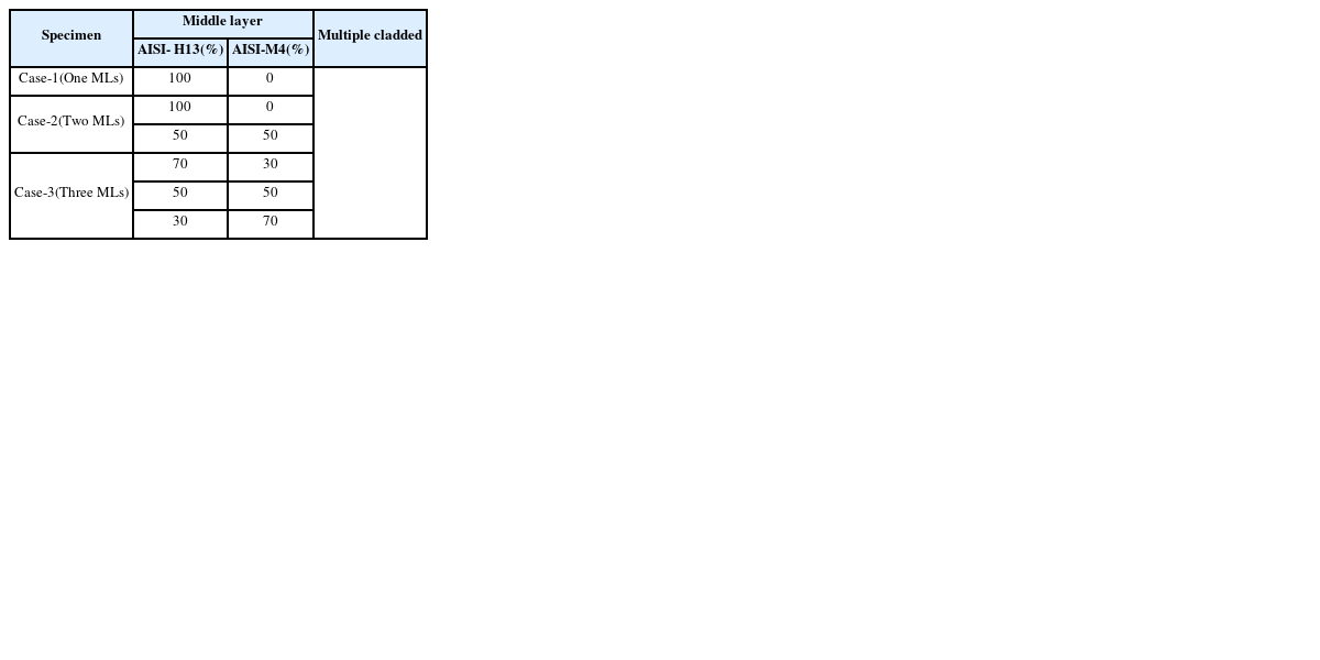 Table 2와 같이 모재(AISI-D2) 위에 3가지 방식으로 클래딩을 실시하였다. 3가지 방식 모두 내마모성이 좋은 AISI-M4 분말을 표면층(Top Layer)에 적층하였고, 중간층의 적층 방식에 따라 Cases-1, 2, 3로 서로 다른 혼합비를 통해 적층을 진행하였다. Case-1은 중간층의 2.25 mm 모두 AISI-H13 분말로 적층 된 경우이고, Case-2는 중간층에 AISI-H13과 AISI-M4의 비율이 50:50으로 0.75 mm 적층한 뒤 나머지 1.5 mm를 AISI-H13 분말을 적층한다. 마지막으로 Case-3는 AISI-H13과 AISI-M4를 각각 70:30, 50:50, 30:70으로 혼합한 분말을 순서대로 0.75 mm씩 적층한 경우이다.