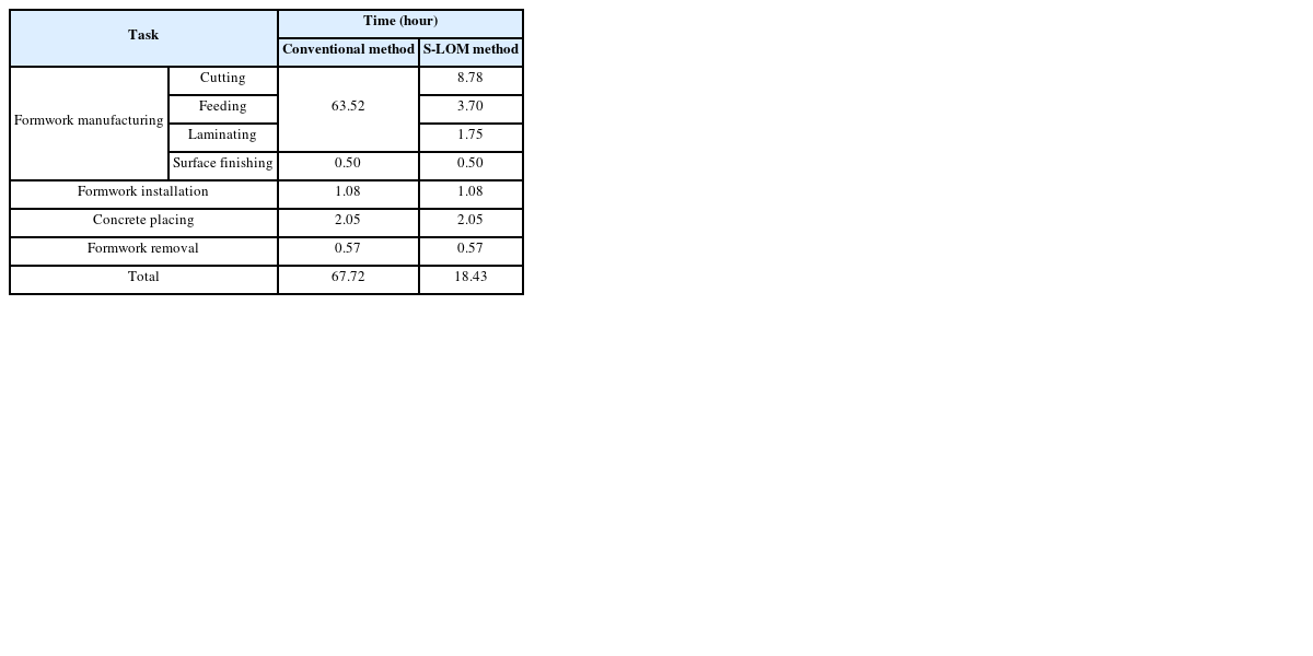 Table 3에 의하면 벽체 구조의 경우 S-LOM 공법을 사용했을 때 약 162 hour/m