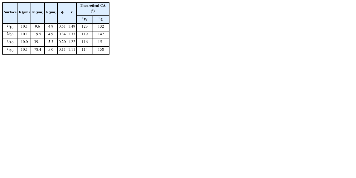 Surface b (μm) w (μm) h (μm) ϕ r Theoretical CA (°)