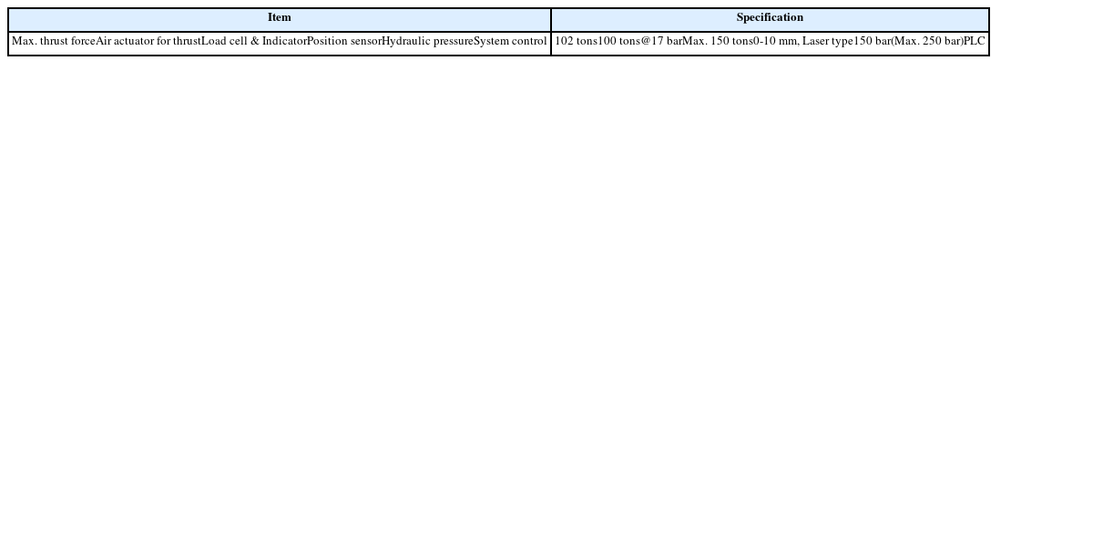 Max. thrust force Air actuator for thrust Load cell & Indicator Position sensor Hydraulic pressure System control |
