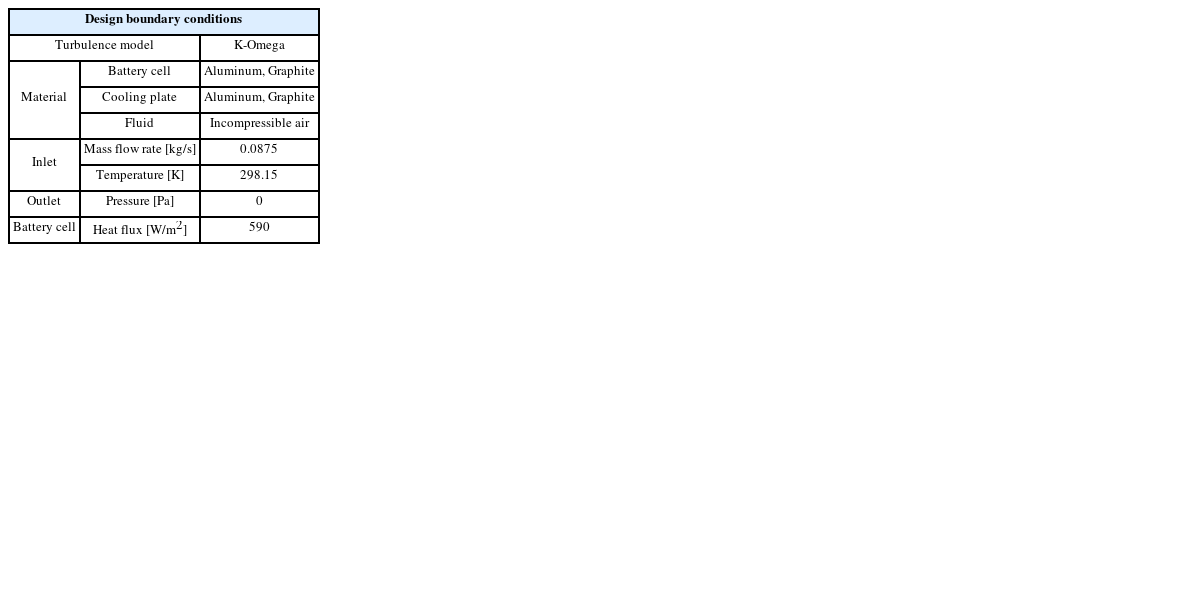 유동해석 조건은 유체와 고체를 분류하여 상호 간의 열교환을 위해 대류 및 전도 열전달 해석 커플링을 하여 FSI (Fluid Structure Interaction-구조를 가진 고체와 내부 혹은 주변 유체 유동을 상호작용하여 해석하는 기법)을 활용하였고, 유체 유동 및 열전달 해석을 위해 열전도, 질량 보존 법칙, 운동량 보존 방정식, 에너지 보존 법칙을 적용하였고, 작동 유체의 최대 유속이 압축성 유동 고려대상인 음속의 0.3배에 훨씬 못 미치는 44.4 m/s로 계산됨으로 ANSYS FLUENT V19.3로 비압축성 유동해석을 하였다. 12개의 배터리 셀과 셀 사이의 간극을 기준 길이로 설정하여 내부 유동의 최대 레이놀즈 수가 9,216으로 계산되어 난류 해석을 진행하였으며, 경계층 흐름에 대해 더 많은 계산을 수행하고 해석 결과의 정확도를 향상시키기 위해 난류 모델 K-Omega Standard를 선택하여 사용하였다. 배터리 셀의 재질은 설계 형태에 따라 알루미늄과 그래파이트를 적용하였고, 냉각판의 재질도 설계 형태에 따라 알루미늄과 그래파이트를 적용하였으며, 표면에 점착 조건(No Slip Condition)을 주며 열교환을 위해 열전도를 설정하였다. 배터리 셀의 최적 작동 온도는 293-323 K이며, 333 K 초과할 시 배터리 셀의 효율이 급격히 감소하게 된다. 외기 온도 298.15K와 배터리 셀의 한계 작동 온도 333 K를 고려하여 일정 열 유속(590 W/m2)을 열 경계 조건으로 사용하였다. 유동장의 표면에는 Wall 조건, 점착 조건을 설정하였다. 유체(공기) 온도는 상온을 기준으로 하여 298.15 K를 부여하였고, 입구 조건은 글로벌 완성차 업체 ㈜T사의 차량 배터리 냉각용 팬에서 일반 주행 시 200 CMH (Cubic Meter per Hour)를 유입하고, 고속 주행 시 냉각팬의 RPM 수가 증가하게 된다. 본 연구에서는 일반 주행 대비 30% 고속 주행 시를 가정하여 260 CMH를 선정하였고 0.0875 kg/s의 질량 유량을 도출하였다. 출구는 대기압으로 가정하여 계기압력 0 Pa을 부여하였다.