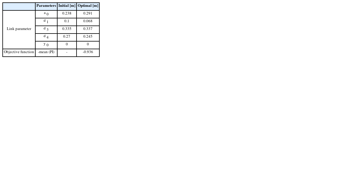 여기서 ϰ는 Condition Number, W는 작업 영역(Work Space)을 의미한다. GCI 값은 1에 가까울수록 좋은 성능을 나타낸다. 초기값과 최적화 결과에 대한 GCI는 각각 0.413과 0.556으로 동작 성능이 약 35% 향상된 것을 알 수 있다.