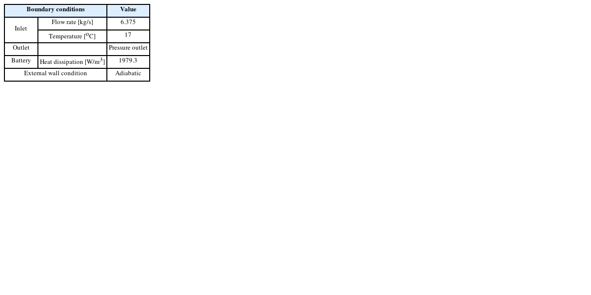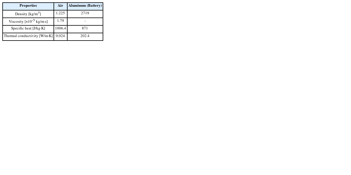 냉각 공기는 비압축성 기체이며 배터리의 재질은 알루미늄으로 설정하였다. 적용된 물성치는