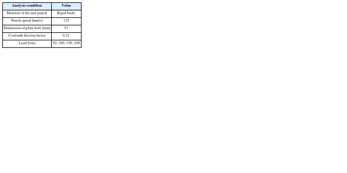 12 SPCC 소재인 플레이트의 피어싱 및 블랭킹 공정 성형 해석을 위한 해석 조건으로 소재와 금형의 초기 온도는 냉간 공정임을 고려하여 20°C로 설정하였다. 펀치와 다이 사이의 클리어런스는 제품 두께의 5%인 0.15 mm, 펀치 속도는 125 mm/s로 설정하였다. 플레이트의 직경은 90이고, 두께는 3 mm이다. 전단마찰상수(Shear Friction Factor)는 위치와 시간에 따라 변할 수 있지만, 실제 이에 대한 조건을 구하기 어려우므로 해석에서는 통상 상수값을 이용한다. 본 해석에서는 냉간 공정임을 고려하여 0.12로 설정하고 해석을 수행하였다.