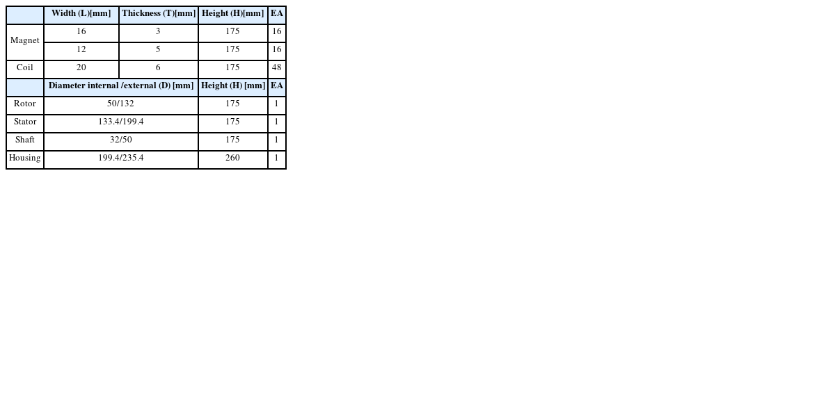 Table 1은 CATIA V5 R21을 활용하여 모델링한 하우징, 고정자, 코일, 회전자, 영구 자석, 동력 전달 축의 실물 크기와 개수를 표로 나타낸 것이다.