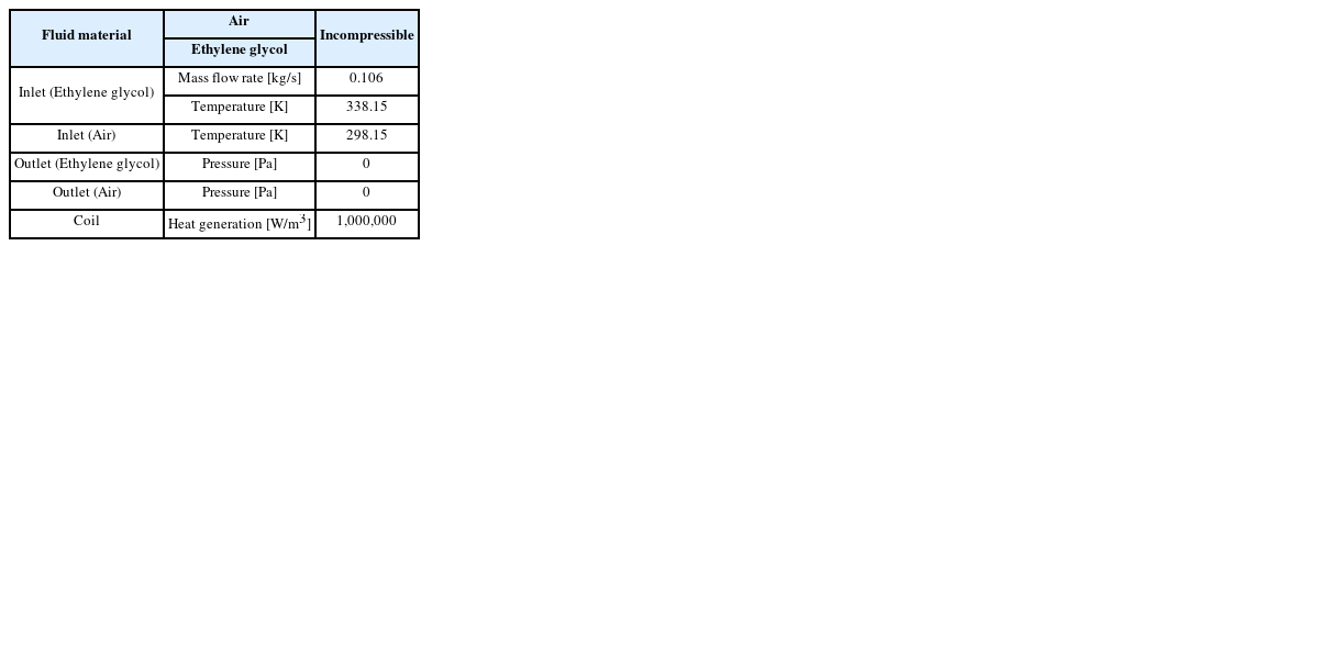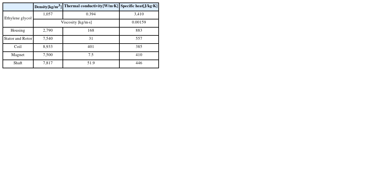 Table 2는 열 및 유동해석을 진행하기 위한 경계 조건들을 표로 정리한 것이다. 냉각 채널에 유입되는 냉각수는 실제 사용하고 있는 물과 1 : 1 비율로 혼합한 Ethylene Glycol을 선택하였고, ANSYS FLUENT V20.2에 입력한 Ethylene Glycol, 하우징, 고정자, 코일, 회전자, 영구 자석, 동력 전달 축의 밀도, 비열, 열전도율, 점성 계수의 물성치들을