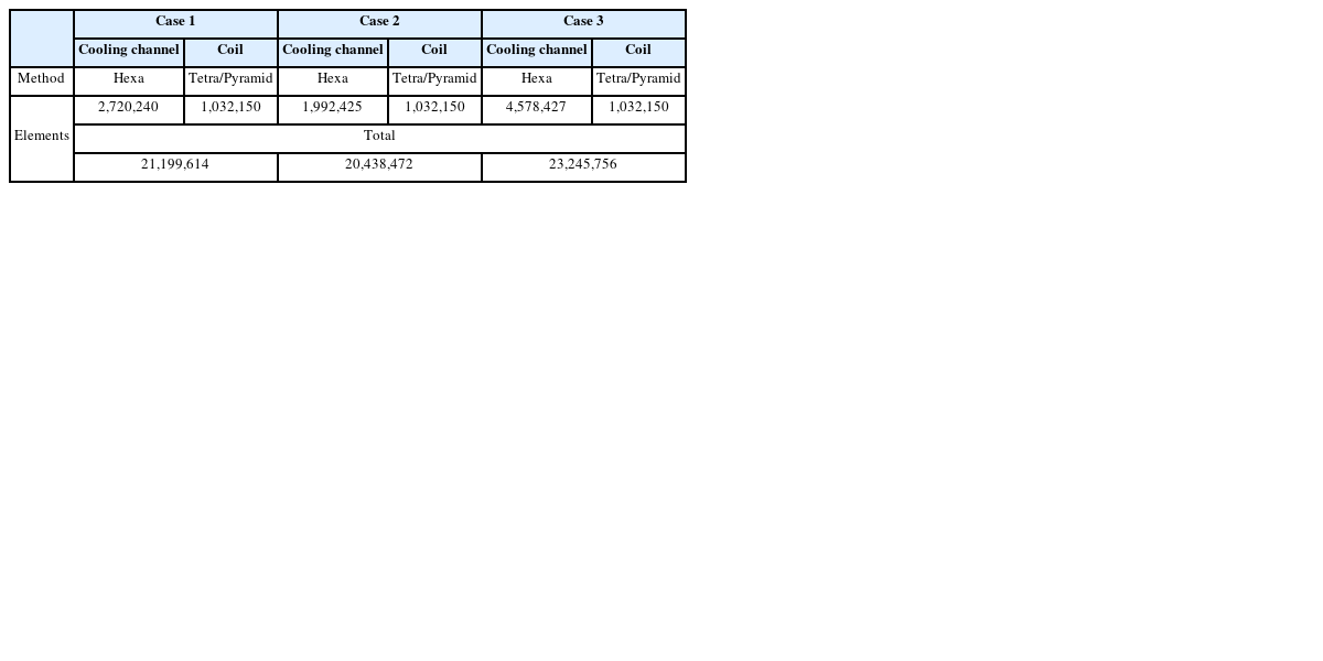 (3) 방열핀 부착에 따른 냉각 채널에서의 강제 대류를 통해 코일의 온도 분포를 비교해본 결과 Case 3에서 코일의 최고온도와 최저온도가 가장 낮게 나타났다. Case 1에 비해 최고온도 4.7%, 최저온도 6% 낮게 나타났고, Case 2에 비해서는 최고온도 1.7%, 최저온도 1.7% 정도 낮게 나타났다.