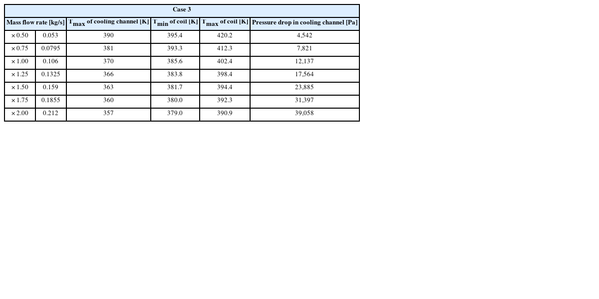 냉각 채널에서의 질량 유량이 증가할수록 냉각 채널의 최고온도는 감소하지만 온도가 감소하는 비율은 점점 낮아지는 것을 알 수 있다. 코일의 최저온도와 최고온도는 0.5배(122.25, 147.05oC), 0.75배(120.15, 139.15oC), 1배(112.45, 129.25oC), 1.25배(110.65, 125.25oC), 1.5배(108.55, 121.25oC), 1.75배(106.85, 119.15oC), 2배(105.85, 117.75oC)로 나타났다.
