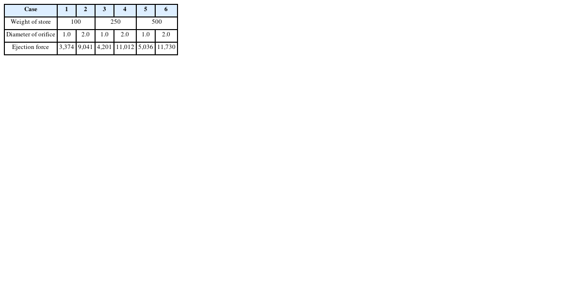 따라서, 계산에 적용한 오리피스 직경은 1.0과 2.0이며 외부 장착물 중량은 100, 250, 500이다. 단, 단열 조건으로 외부 온도에 대한 영향은 고려하지 않았다. 수식을 통하여 계산한 최대 사출력은