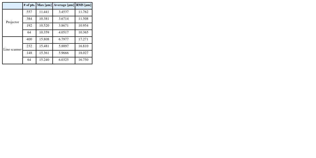 Table 1에 정리하였다. 기어 테스터는 스타일러스를 이용하여 치형을 접촉하여 측정하며 동심도 및 흔들림(Runout)이 0.3 μm 이하이며, 투영기는 측정 물체에 빛을 비추고, 외곽을 정밀하게 측정하며 0.1 μm의 분해능을 가진다. 레이저 라인 스캐너는 측정 물체에 직선의 레이저를 비추어 정확히 측정하며 2.5 μm의 분해능을 가진다.