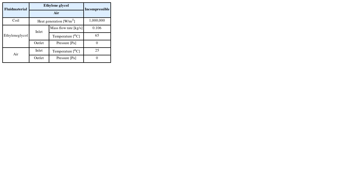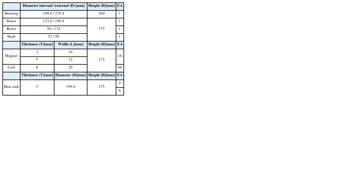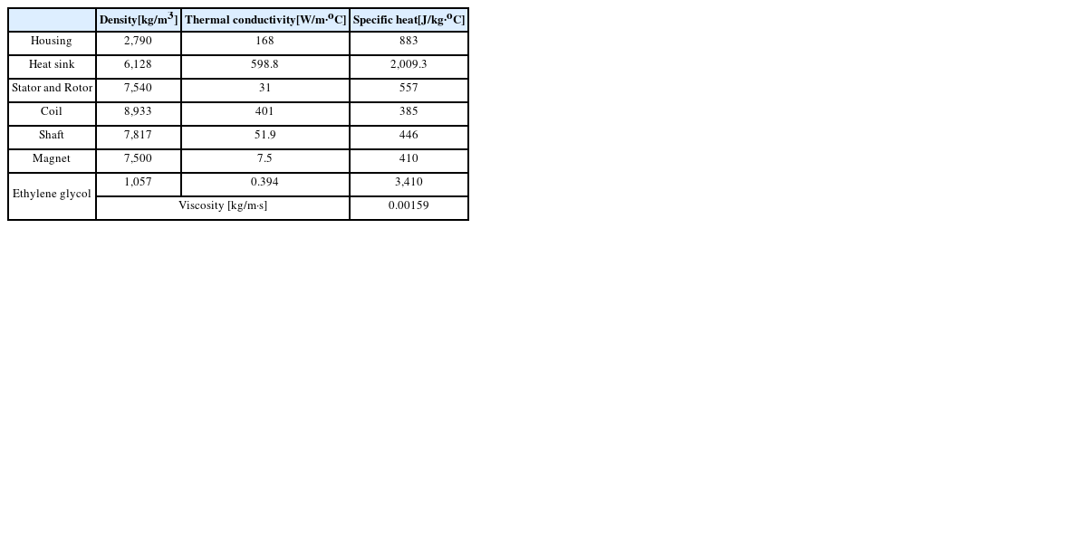 Table 2는 열 및 유동해석을 위한 경계 조건들을 표로 나타낸 것이다. 해석에 사용된 재질은 냉각수는 많은 모델에 사용되는 Ethylene glycol, 하우징은 Aluminum Alloy 195, 메탈 하이브리드 소재는 Ag와 Gr의 혼합비가 5 : 5인 소결체, 코일은 Cooper, 자석은 Nd(Dy) FeB, 축은 Carbon-Silicon Steel, 회전자와 고정자는 No. 30 Steel를 입력하였고, 해석에 필요한 밀도, 비열, 열전도율, 점성계수의 물성치를