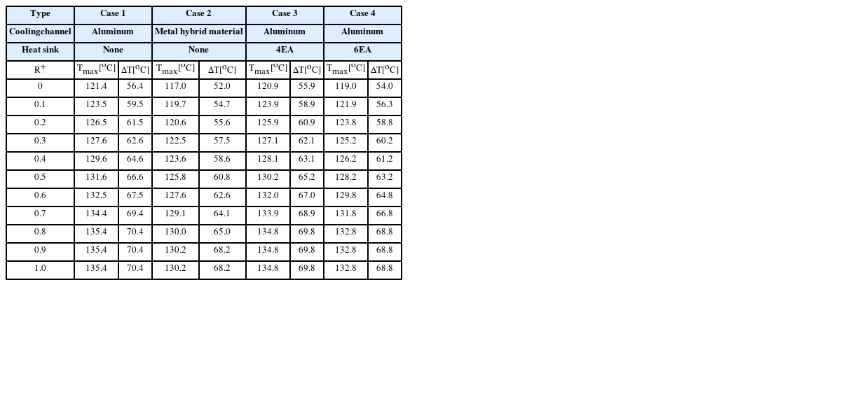 (5) 냉각판의 개수가 적을 경우 최고 온도의 변화는 미미하지만 최저 온도와 평균 온도가 낮아진 것을 보아 국부적으로 고온 발생을 제어하는 효과를 지니는 것을 알 수 있었고, 냉각판의 개수가 많을 경우 최고 온도와 평균 온도 모두 감소한 것을 확인하였고, 우수한 열전도 효과를 얻을 수 있었다. 냉각 채널 재질을 알루미늄이 아닌 메탈 하이브리드 소재를 적용함으로써 최고 온도, 평균 온도, 온도 편차가 모두 감소한 것을 확인하였고, 균일하고 우수한 열전도 효과를 얻을 수 있었다.