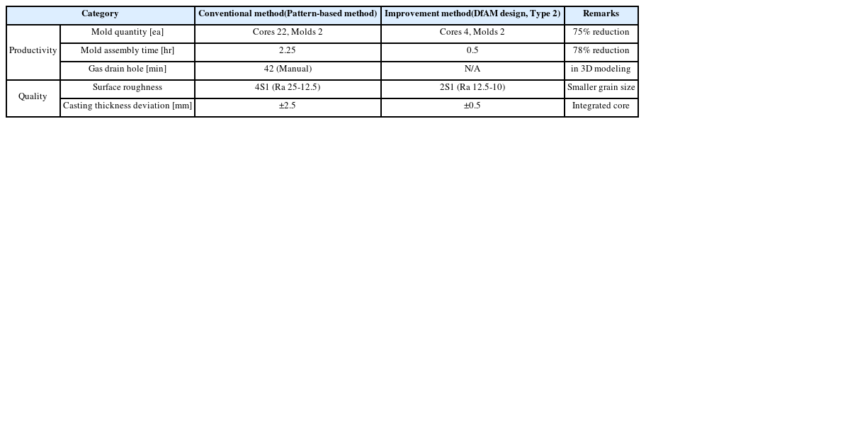 Table 1과 같다. 기존 방식의 경우에는 외형 몰드 2개와 중자 28개로 총 30개 수량으로 조립 및 합형을 진행해야 하지만, 본 연구에서 제안한 유형1 방식을 적용한 경우에는 부분 일체화 몰드를 포함하여 총 18개의 수량으로 조립 및 합형 작업을 진행할 수 있었다. 즉, 40%의 몰드/중자 수를 줄이는 효과가 있고, 이로 인한 합형 시간은 기존 방식 2시간 대비 유형1 방식은 0.5시간으로 75% 이상 단축 효과를 얻을 수 있었다. 가스빼기 홀의 경우에는 목·금형 방식에서는 40분간의 수작업이 필요하나, 유형1 방식에서는 3D 모델상에 선반영하여 별도의 작업이 필요치 않았다. 품질 관점에서는 주요 부위의 주물살 두께 편차를 측정한 결과, 목·금형 방식에서는 ±2.5 mm 이내인 반면, 유형1 방식에서는 ±0.5 mm 이내로 측정이 되어 우수한 품질 확보가 가능함을 확인하였다. 이는 주요 부위의 형상이 일체화 설계 제작되어 합형 공차가 제거되었기 때문으로 설명할 수 있다. 또한, 샌드 3D 프린팅에서 사용되는 주물사의 입도가 기존 방식의 주물사 입도보다 매우 곱기 때문에 비가공면의 조도 품질 관점에서도 유형1 방식으로 제작한 제품이 우수하였다.
