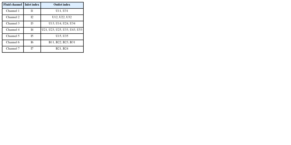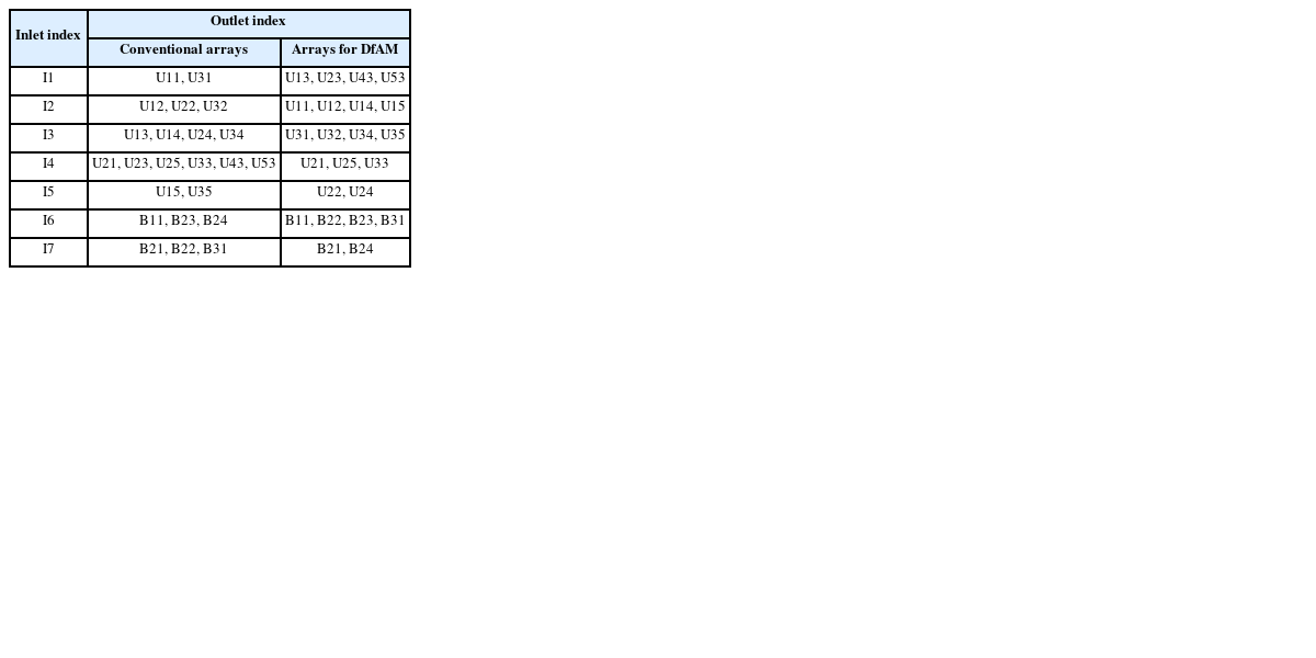 Table 3과 같이 해석 모델의 유로 및 유로 내 입출구에 대하여 정의하여 결과 도출에 사용하였다. 실제 사용 조건에 따라 입구 전 영역에 500 kPa의 압력을 적용하였으며, 출구 압력을 0 Pa으로 설정하여 각 유로별 유량 및 유로 내 압력에 대한 해석을 수행하였다.